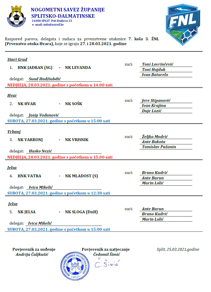 Raspored parova, delegata i sudaca za prvenstvene utakmice 7. kola 3. ŽNL (Prvenstvo otoka Hvara) koje se igraju 27. i 28.03.2021. godine