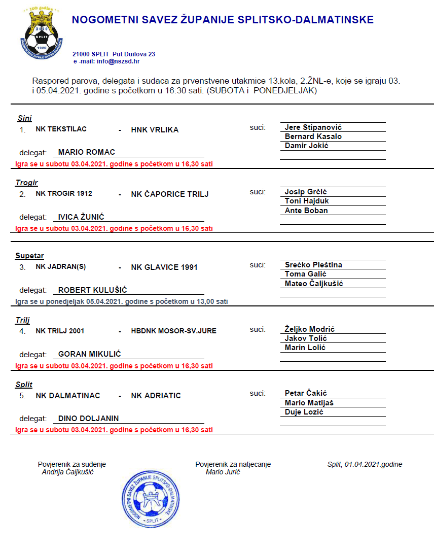 Raspored parova, delegata i sudaca za 13. kolo 2. ŽNL