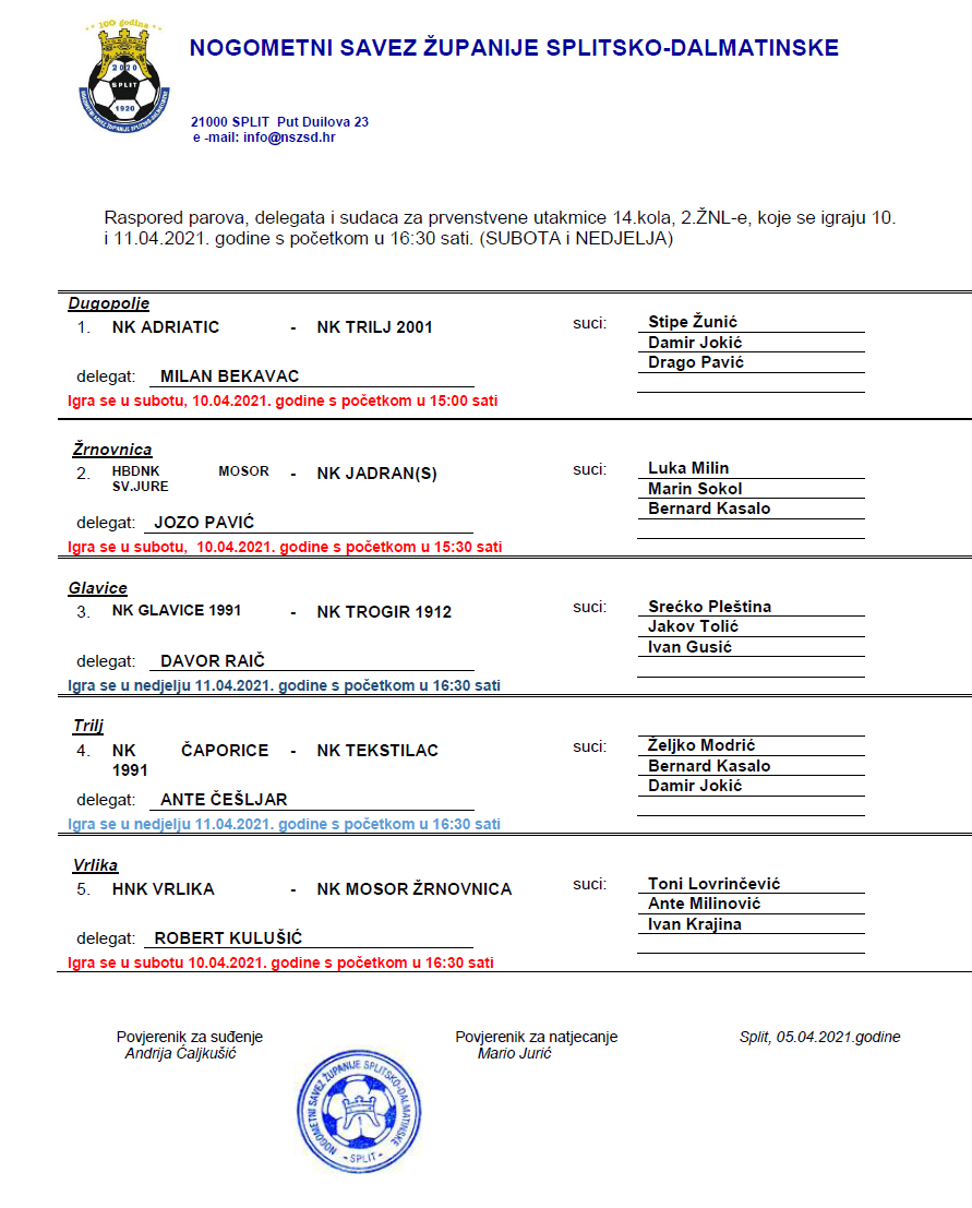 Raspored parova, delegata i sudaca za prvenstvene utakmice 14. kola 2. ŽNL