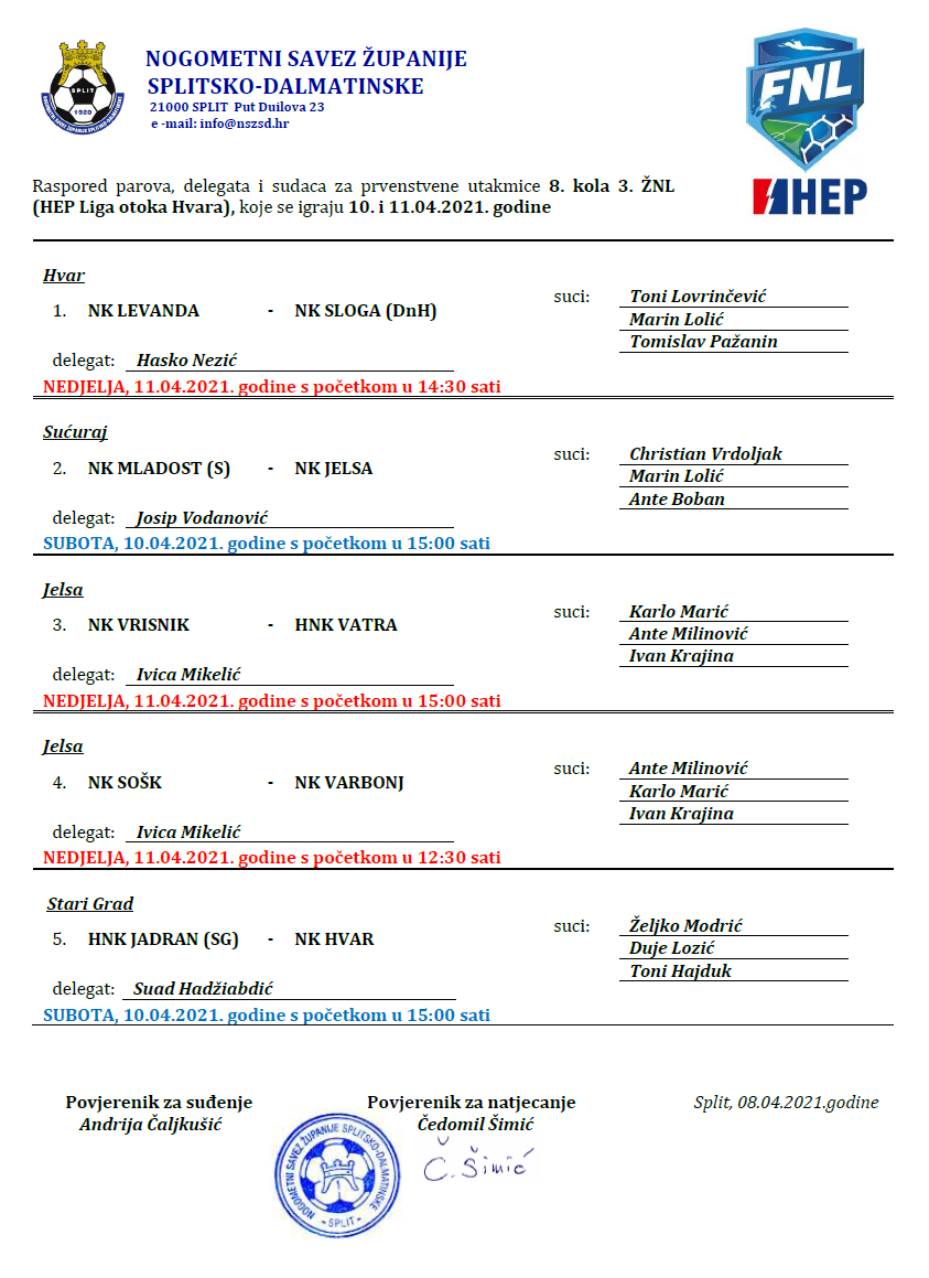 Raspored parova, delegata i sudaca za prvenstvene utakmice 8. kola 3. ŽNL (HEP Liga otoka Hvara) koje se igraju 10. i 11.04.2021. godine