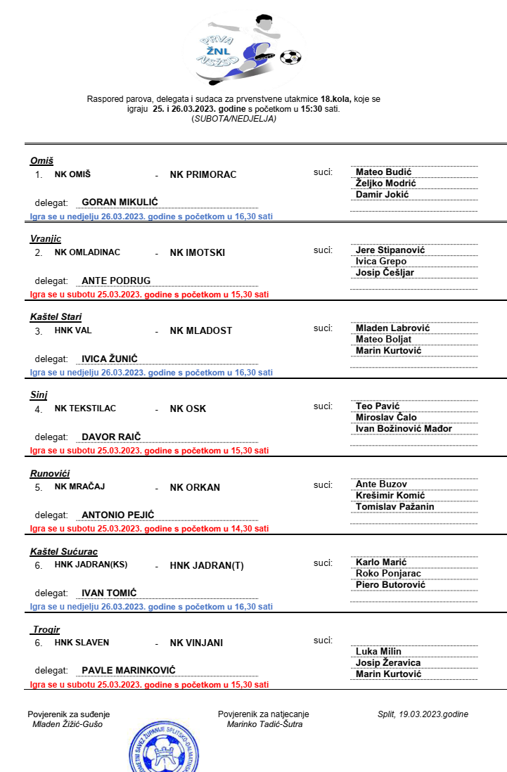 Raspored parova, delegata i sudaca za 18. kolo 1. ŽNL