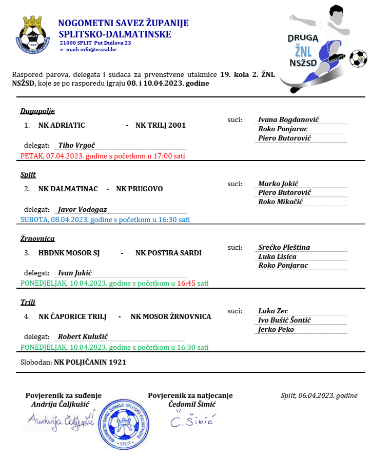 Raspored parova, delegata i sudaca za prvenstvene utakmice 19. kola 2. ŽNL