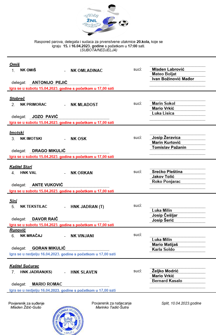 Raspored parova, delegata i sudaca za 20. kolo 1. ŽNL