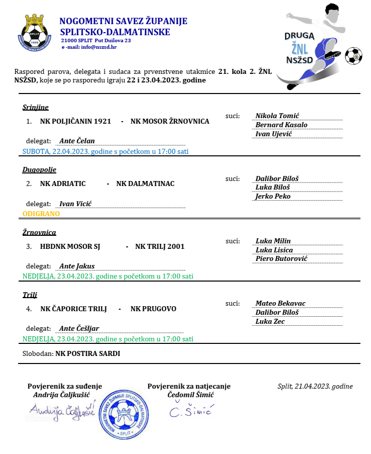 Raspored parova, delegata i sudaca za prvenstvene utakmice 21. kola 2. ŽNL