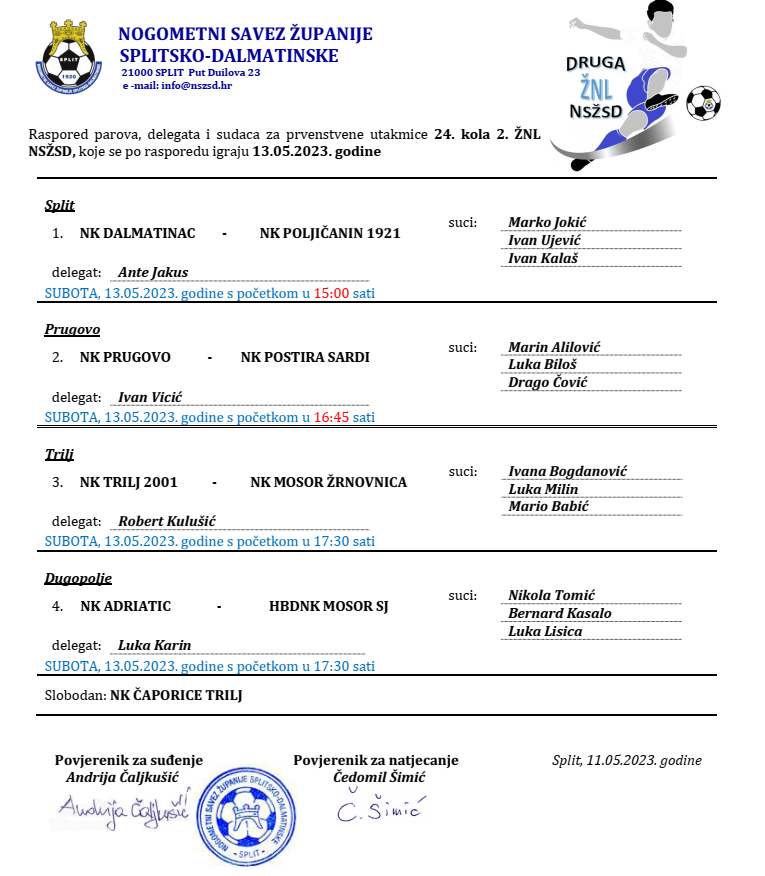 Raspored parova, delegata i sudaca za 24. kolo 2. ŽNL