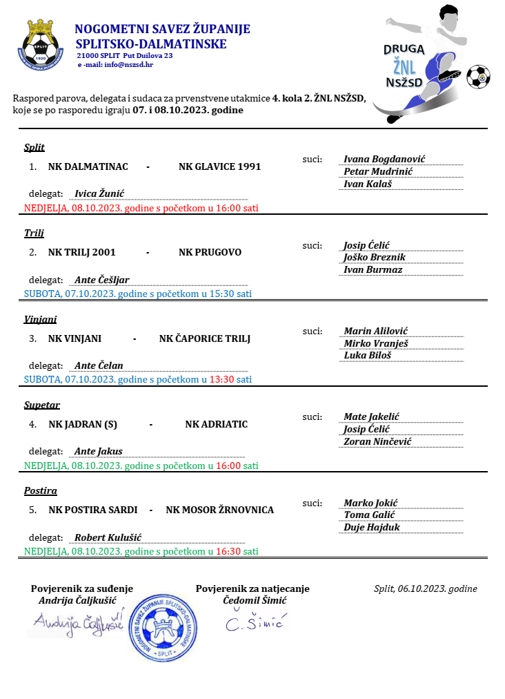 Raspored parova, delegata i sudaca za prvenstvene utakmice 4. kola 2. ŽNL
