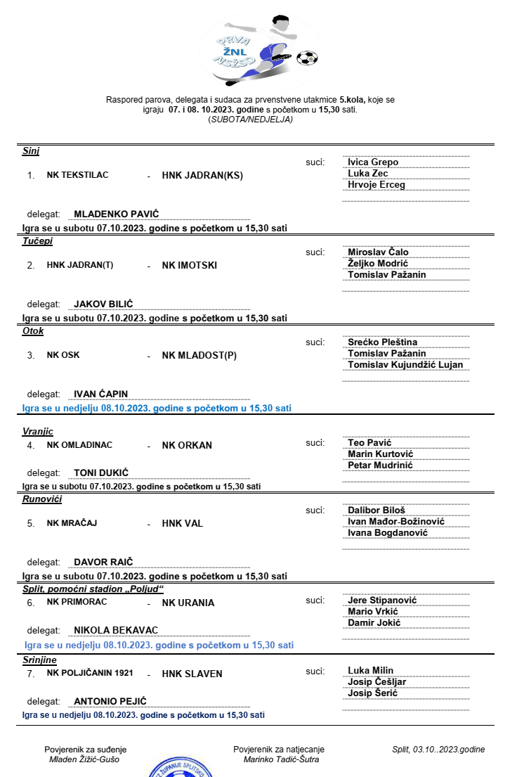 Raspored parova, delegata i sudaca za 5. kolo 1. ŽNL