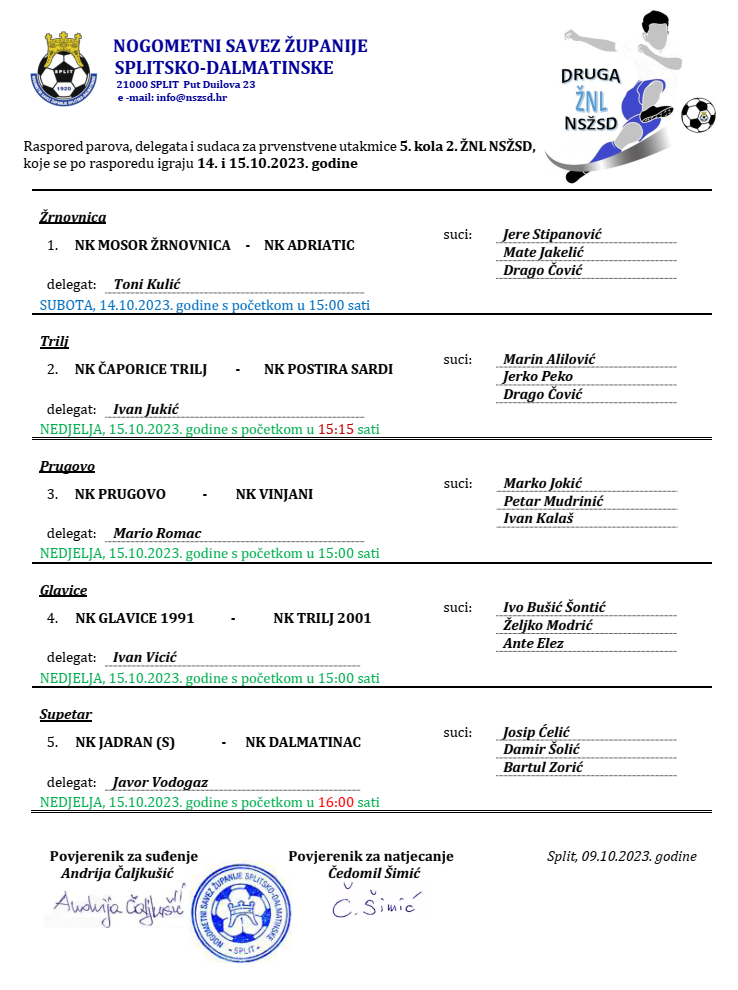 Raspored parova, delegata i sudaca za prvenstvene utakmice 5. kola 2. ŽNL