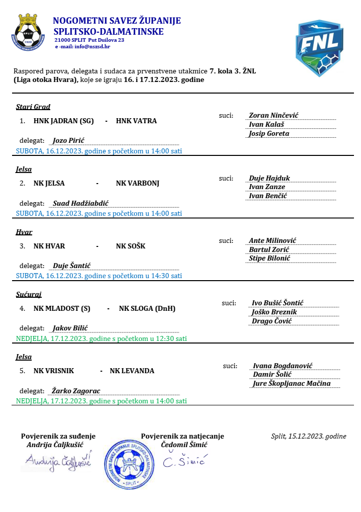 Raspored parova, delegata i sudaca za prvenstvene utakmice 7. kola 3. ŽNL (Liga otoka Hvara) koje se igraju 16. i 17.12.2023. godine
