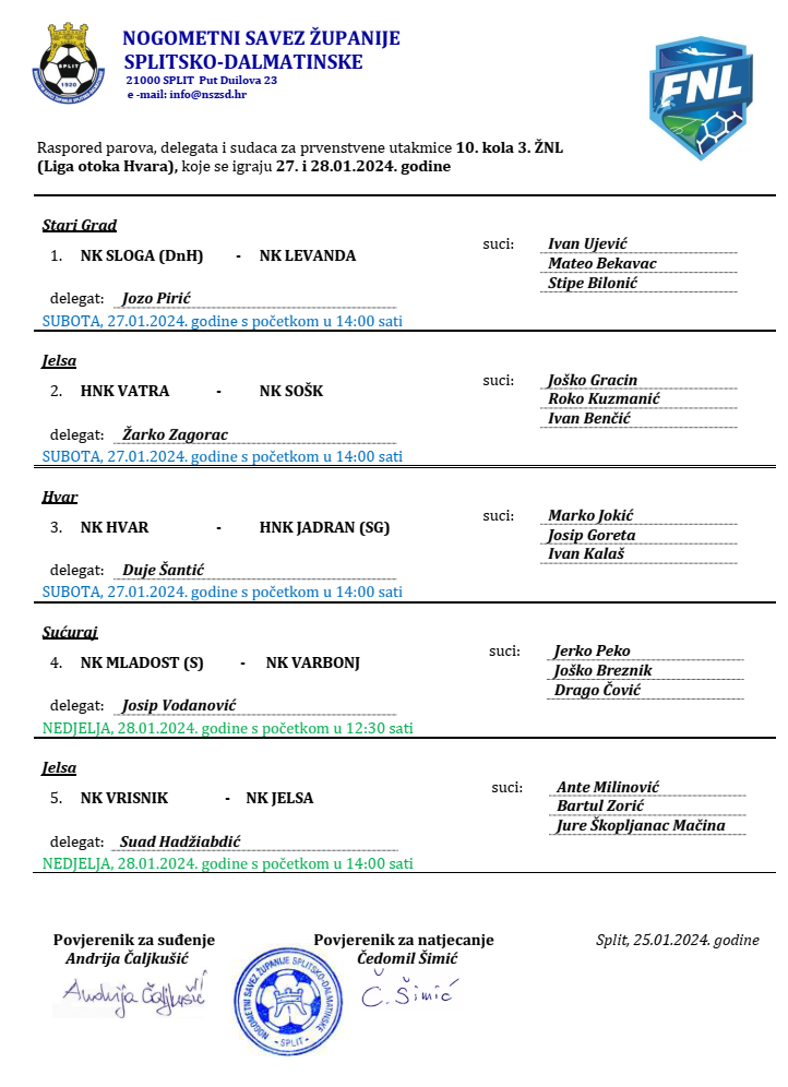 Raspored parova, delegata i sudaca za prvenstvene utakmice 10. kola 3. ŽNL (Liga otoka Hvara) koje se igraju 27. i 28.01.2024. godine