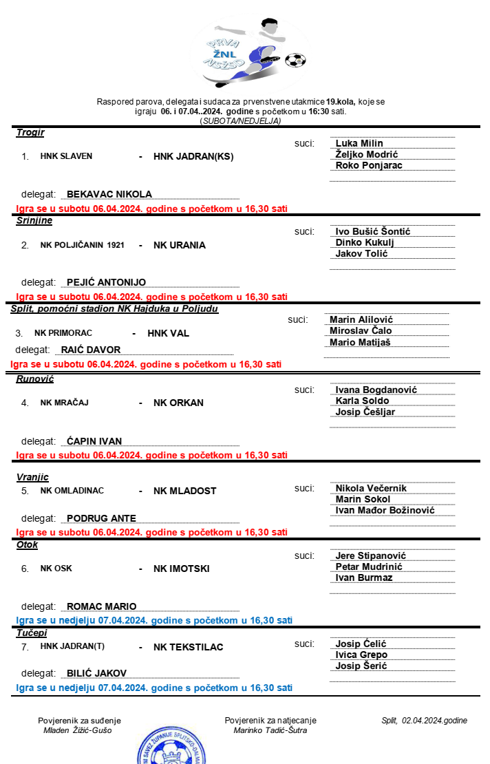 Raspored parova, delegata i sudaca za 19. kolo 1. ŽNL