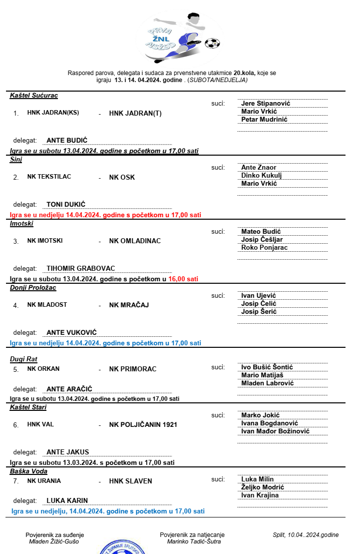 Raspored parova, delegata i sudaca za 20. kolo 1. ŽNL