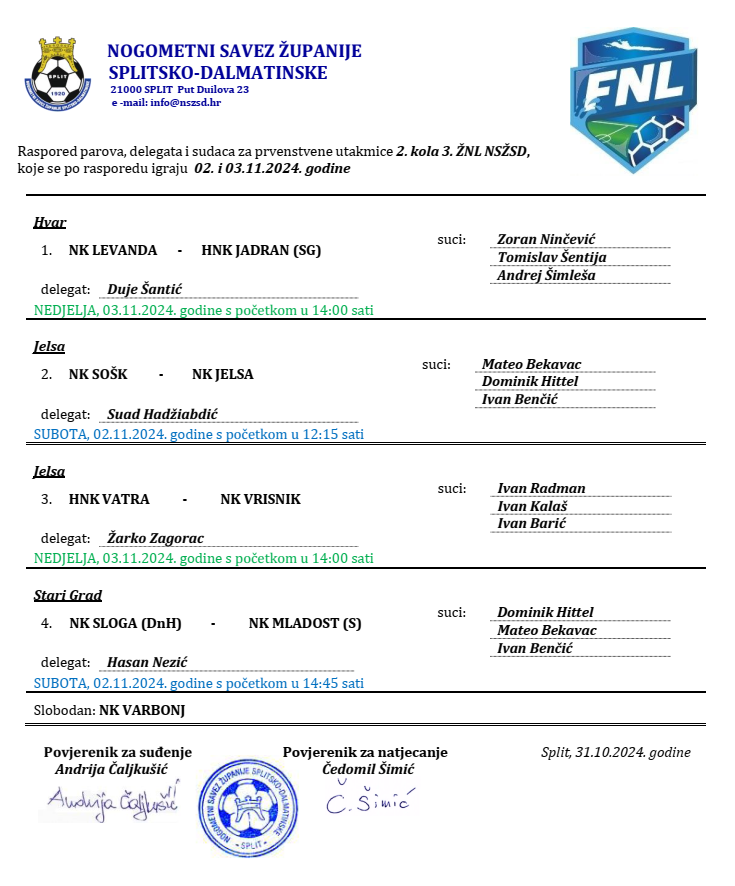Raspored parova, delegata i sudaca za prvenstvene utakmice 2. kola 3. ŽNL (Liga otoka Hvara) koje se igraju 02. i 03.11.2024. godine