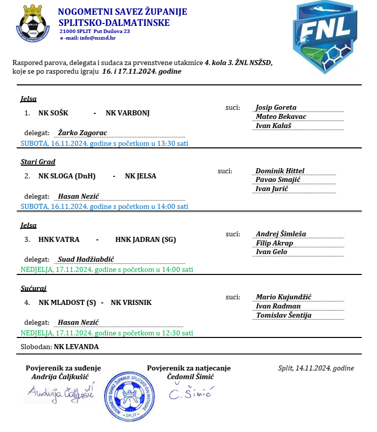 Raspored parova, delegata i sudaca za prvenstvene utakmice 4. kola 3. ŽNL (Liga otoka Hvara) koje se igraju 16. i 17.11.2024. godine