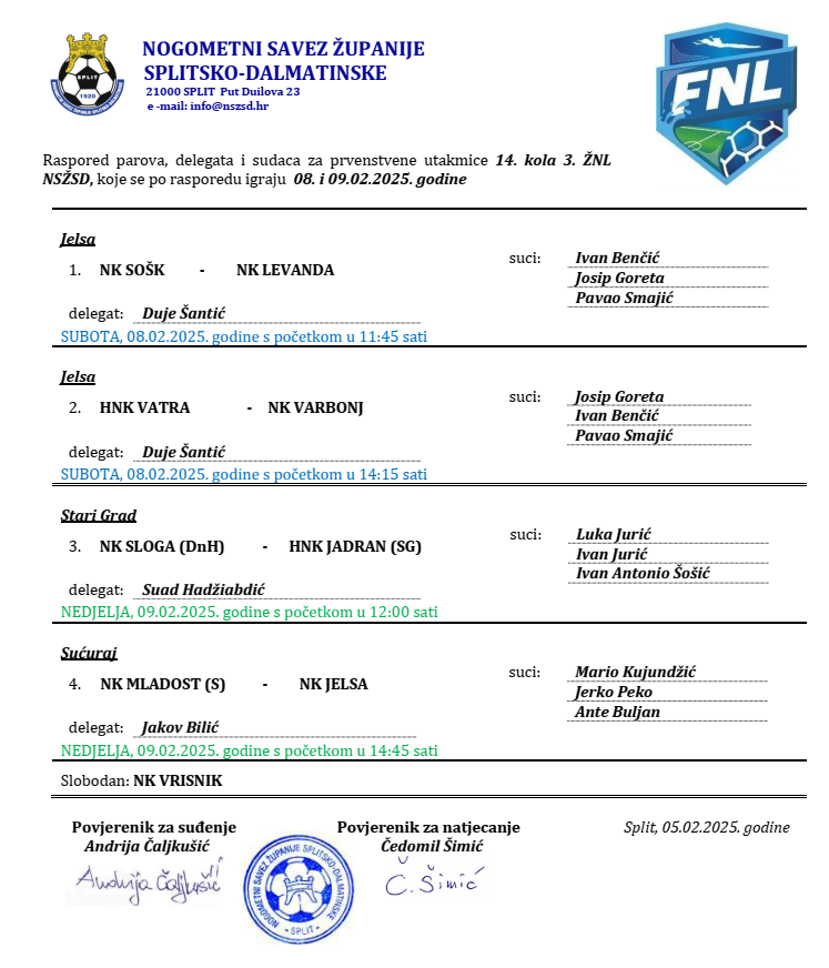 Raspored parova, delegata i sudaca za prvenstvene utakmice 14. kola 3. ŽNL (Liga otoka Hvara) koje se igraju 08. i 09.02.2025. godine