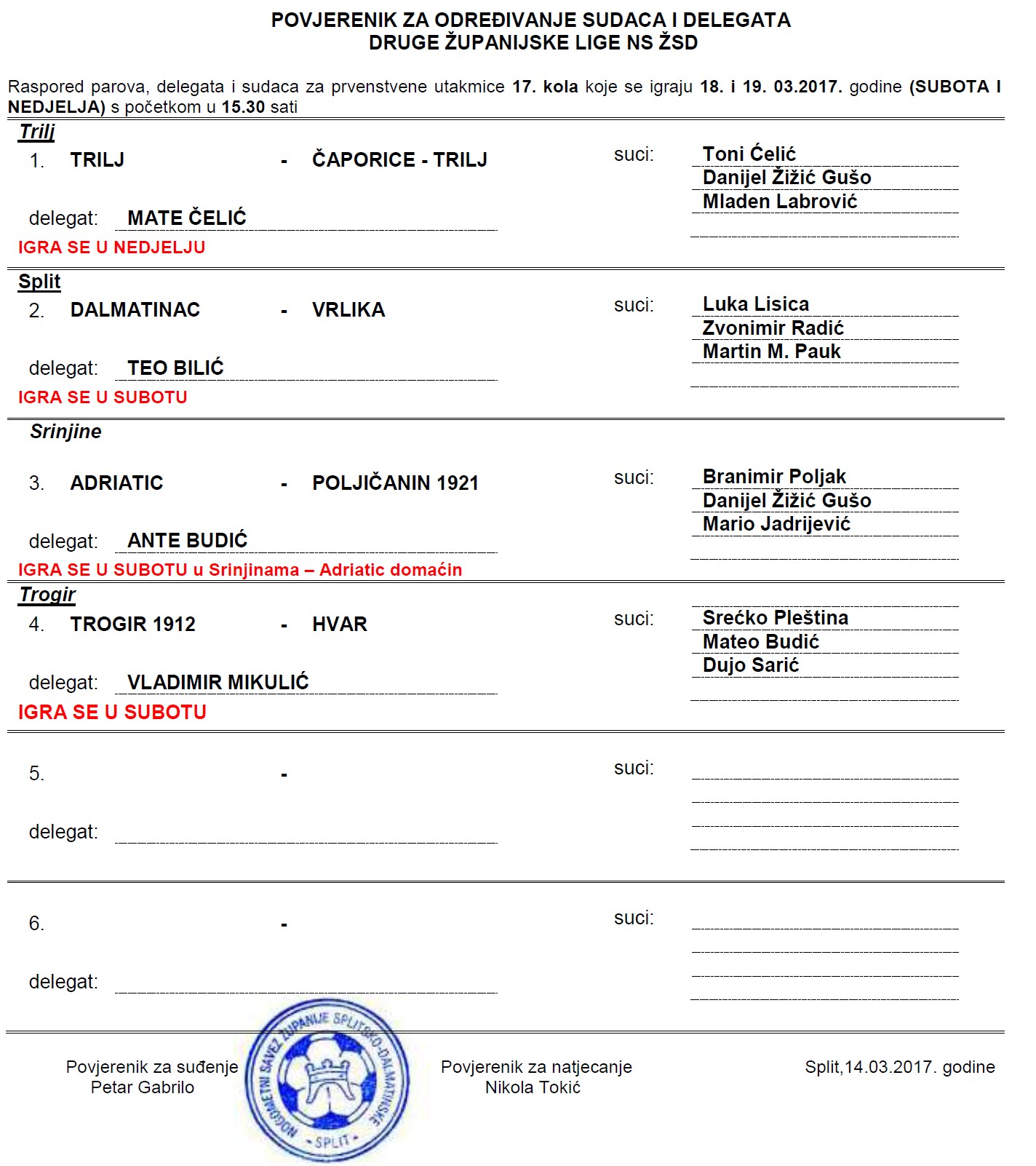 Raspored parova, delegata i sudaca za prvenstvene utakmice 2.ŽNL (17. kolo)