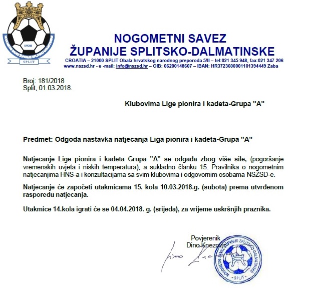 ODGOĐEN NASTAVAK NATJECANJA LIGA PIONIRA I KADETA – GRUPA “A”
