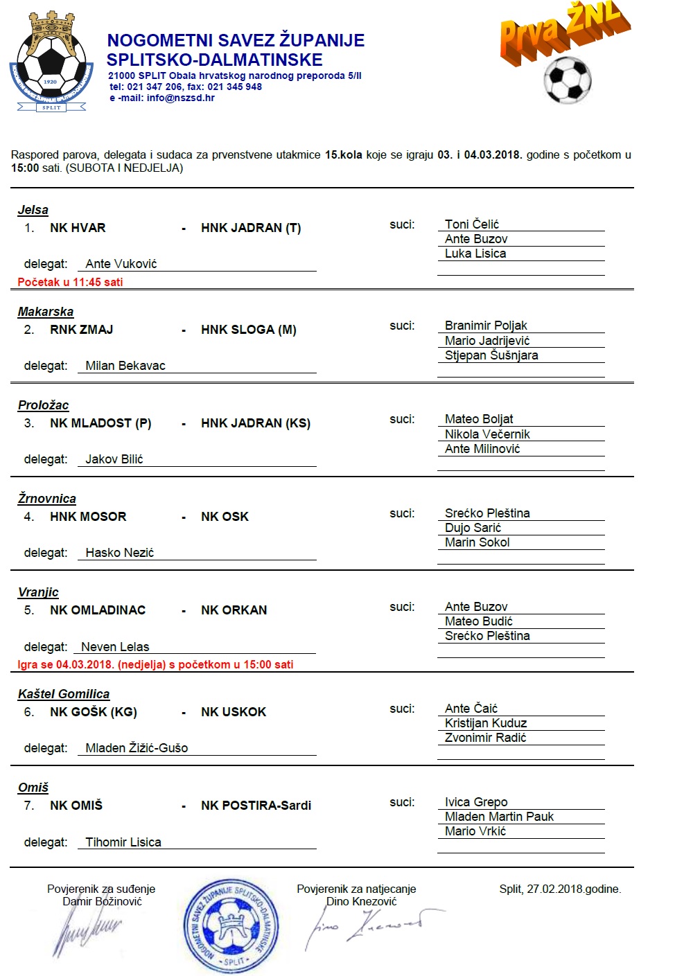 Raspored parova, delegata i sudaca za 15. kolo 1.ŽNL