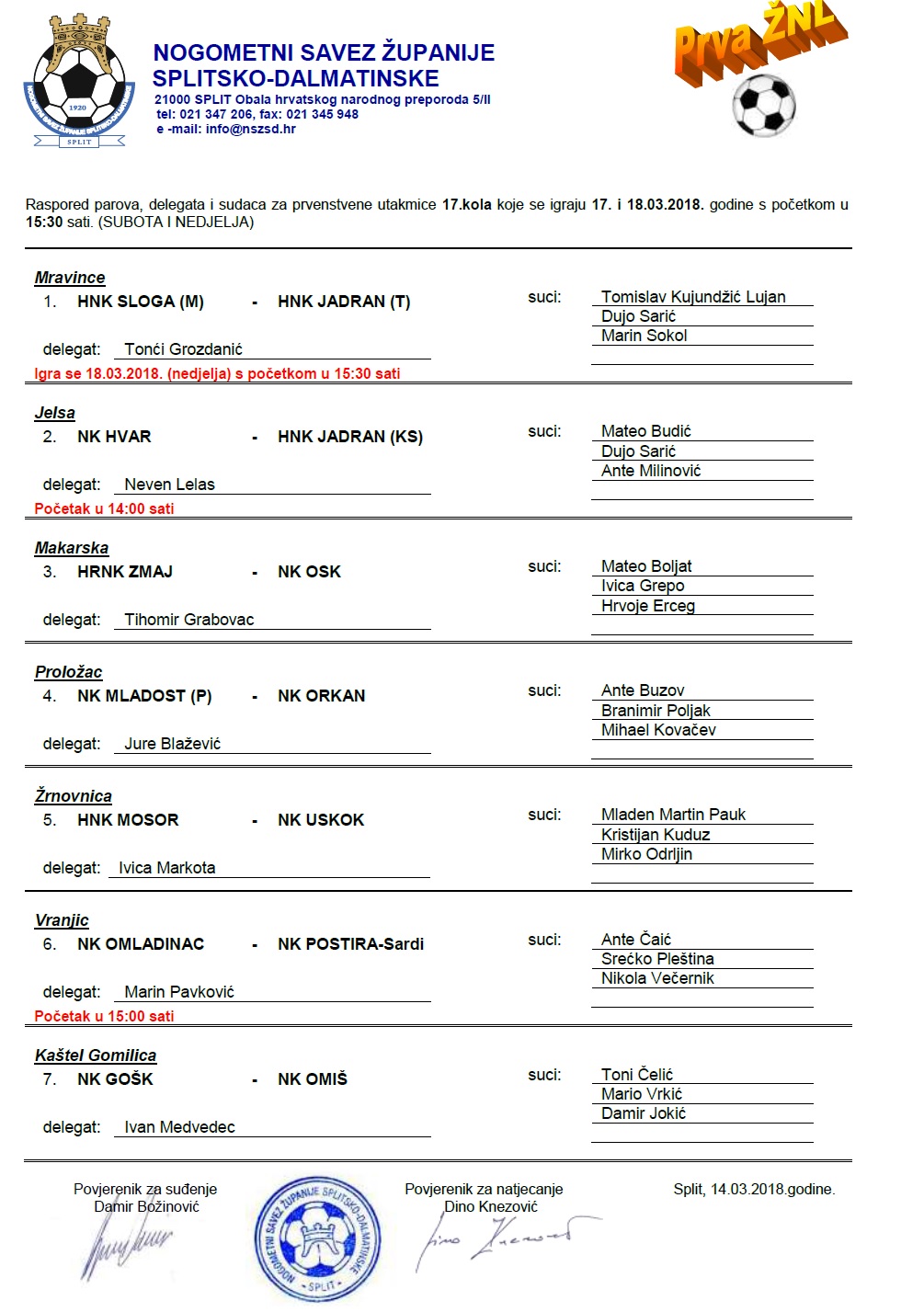 Raspored parova, delegata i sudaca za 17. kolo 1.ŽNL