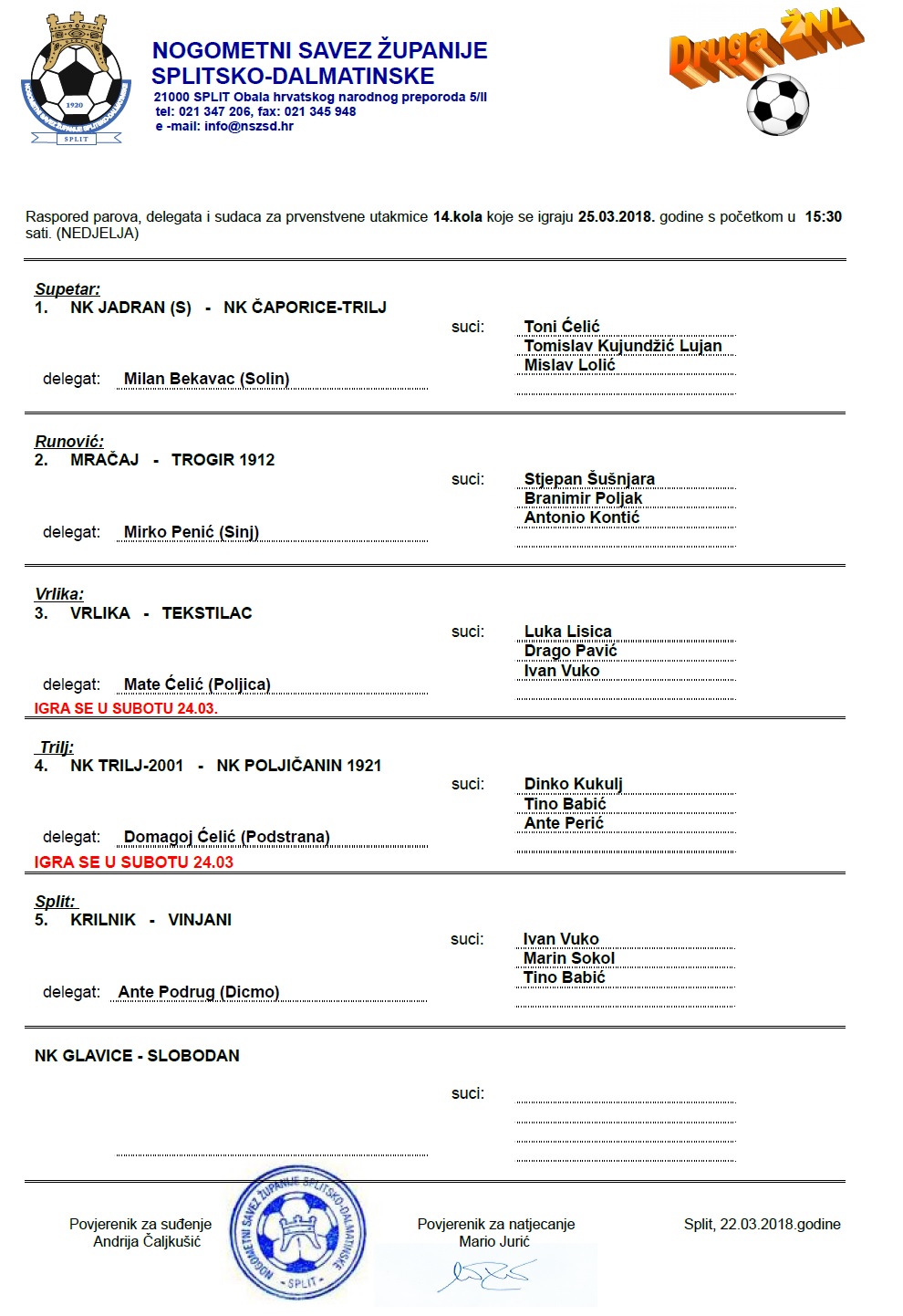 Raspored parova, delegata i sudaca za prvenstvene utakmice 14. kola 2. ŽNL