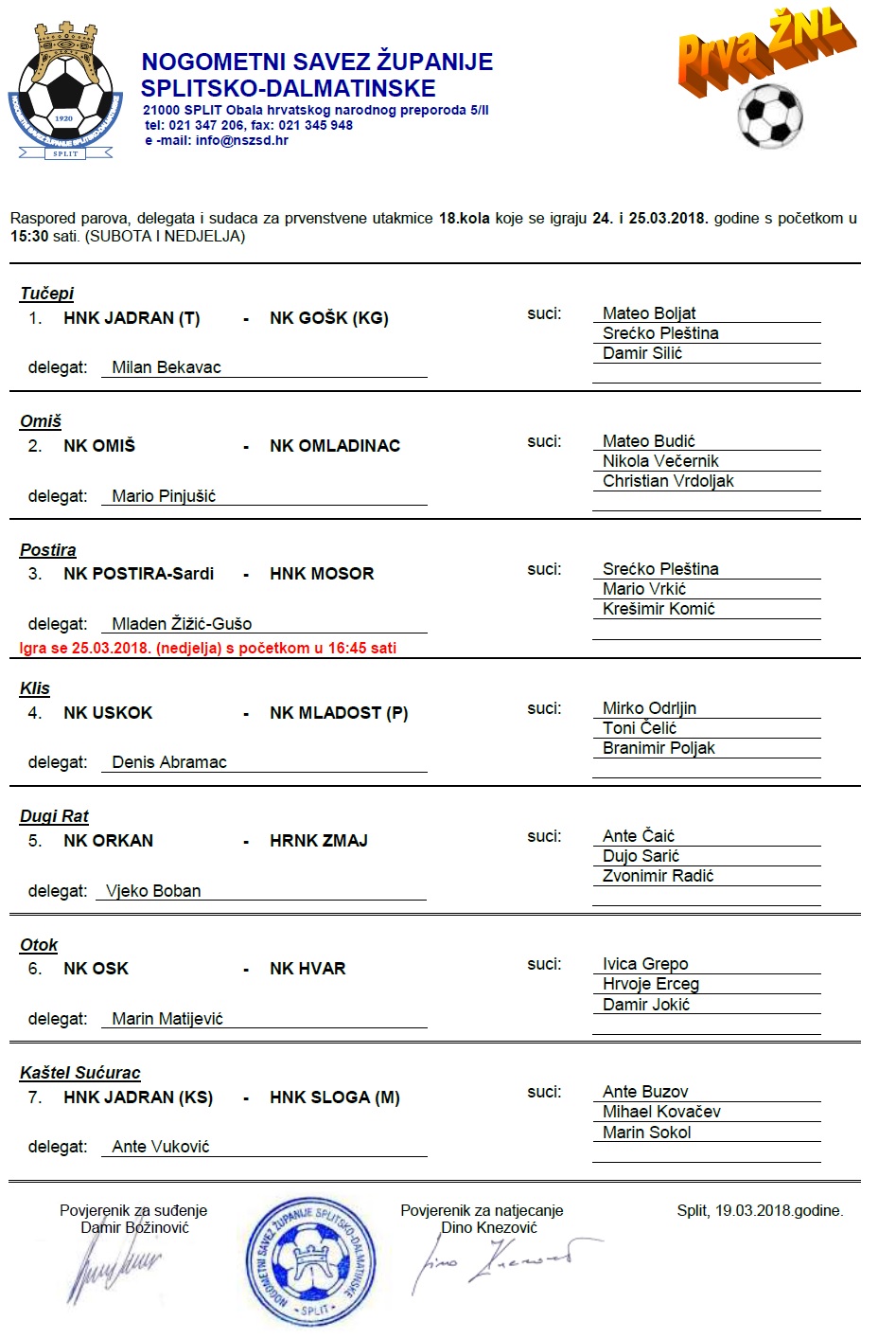 Raspored parova, delegata i sudaca za 18. kolo 1.ŽNL