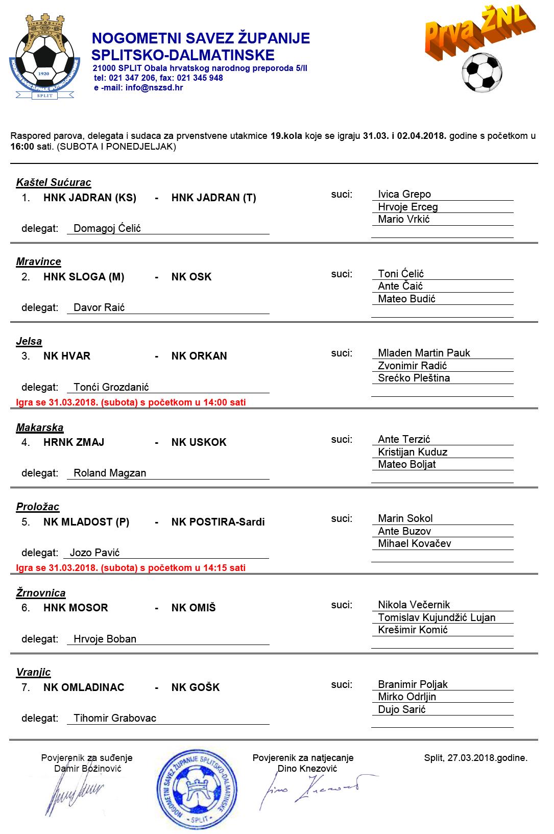 Raspored parova, delegata i sudaca za 19. kolo 1.ŽNL