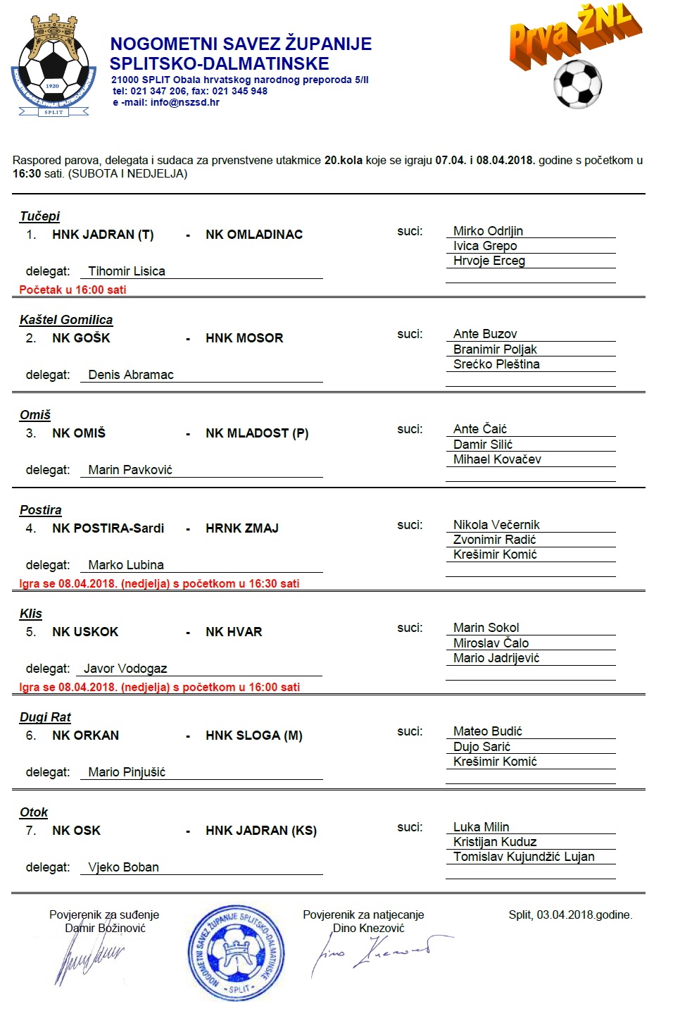Raspored parova, delegata i sudaca za 20. kolo 1.ŽNL