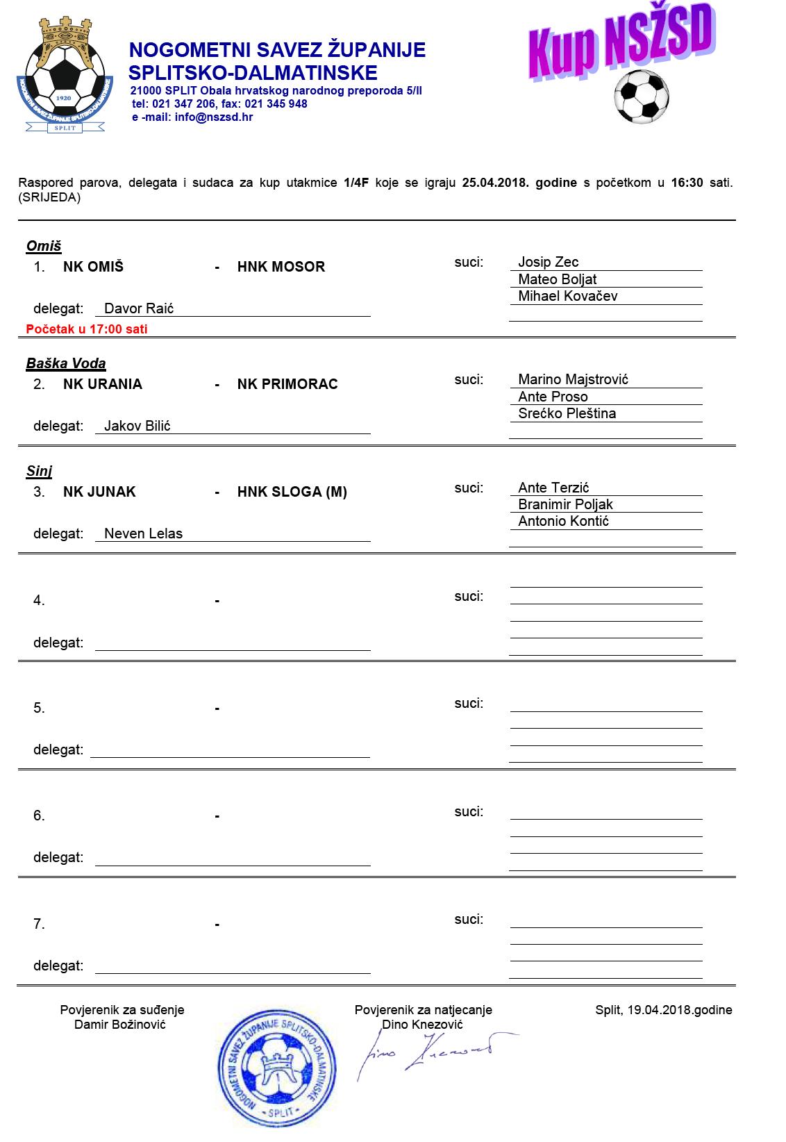 Raspored parova, delegata i sudaca za kup utakmice 1/4F koje se igraju 25.04.2018. godine s početkom u 16:30 sati.