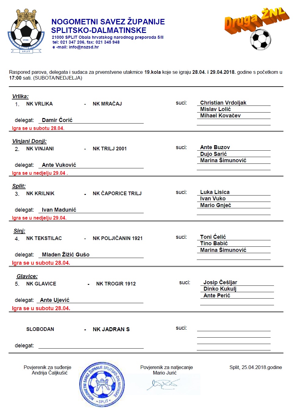 Raspored parova, delegata i sudaca za prvenstvene utakmice 19. kola 2. ŽNL