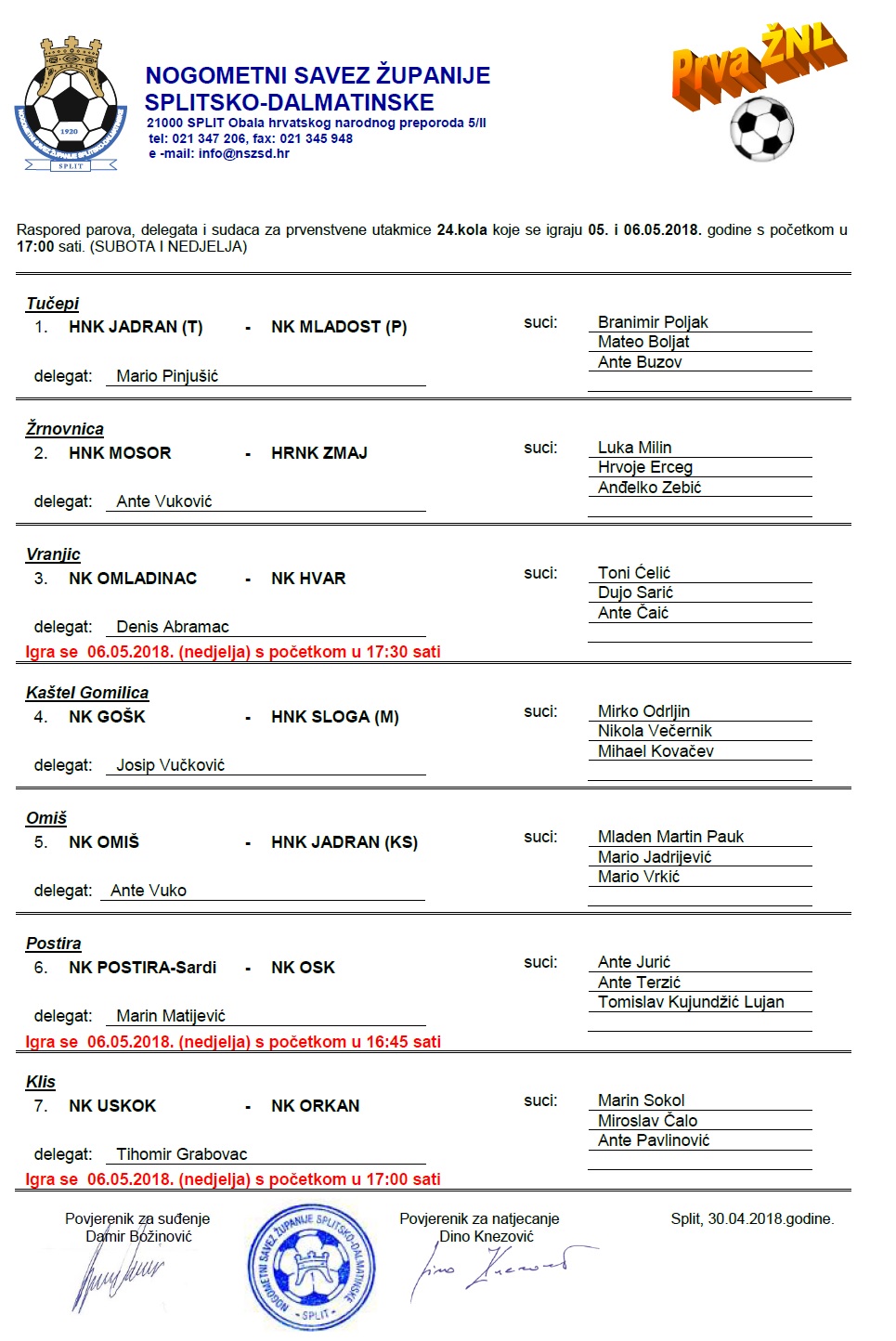 Raspored parova, delegata i sudaca za prvenstvene utakmice 24. kola 1. ŽNL