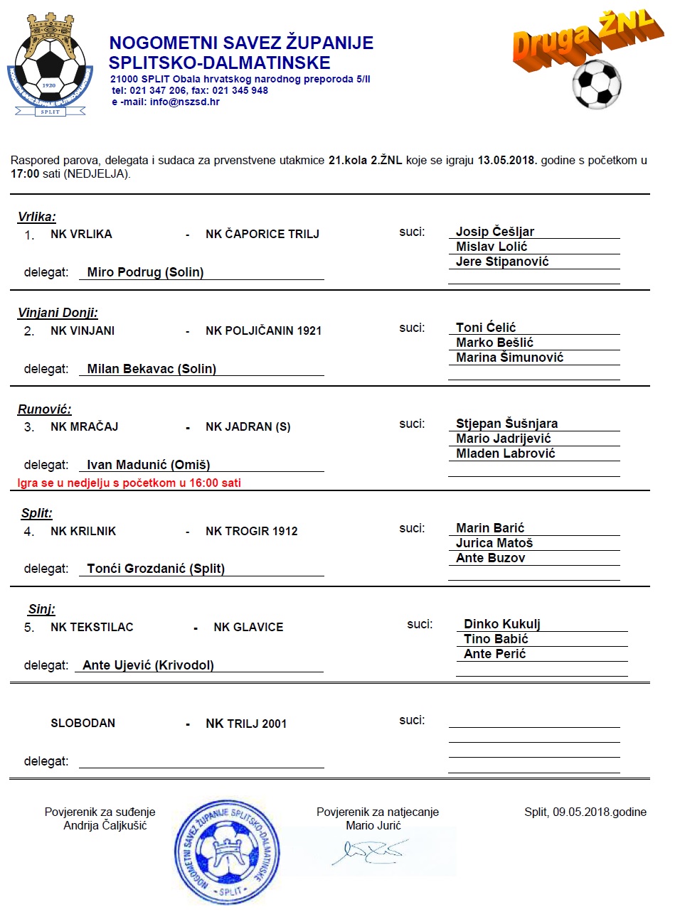 Raspored parova, delegata i sudaca za prvenstvene utakmice 21. kola 2. ŽNL