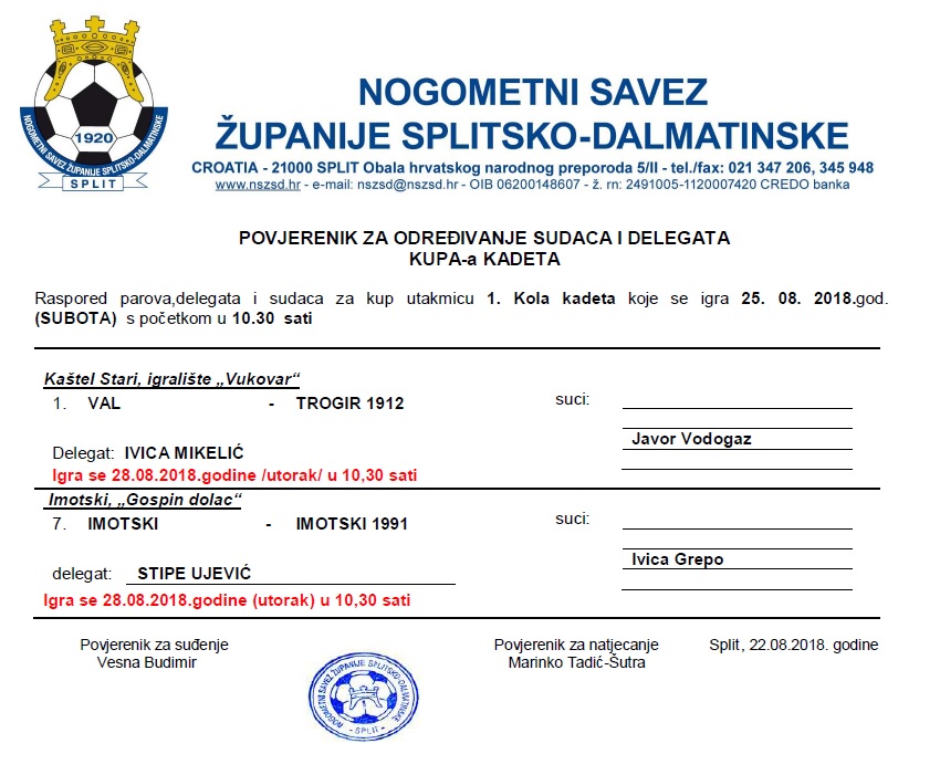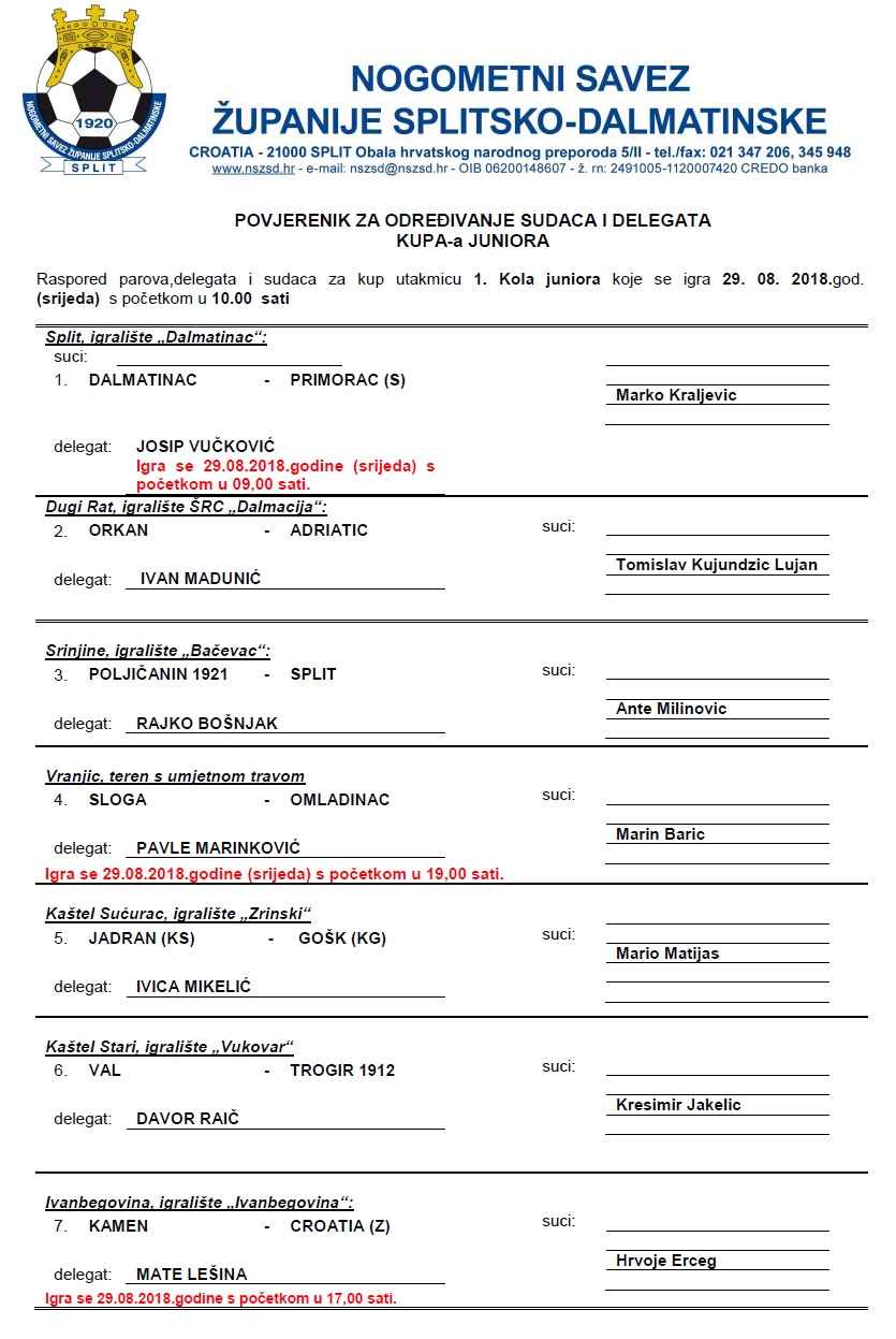 Raspored parova, delegata i sudaca za neodigrane utakmice 1. kola kupa mlađih uzrasta