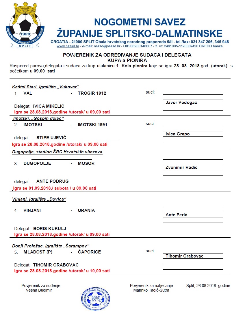 Pioniri- kup (1.KOLO) Preuzmite raspored u pdf formatu