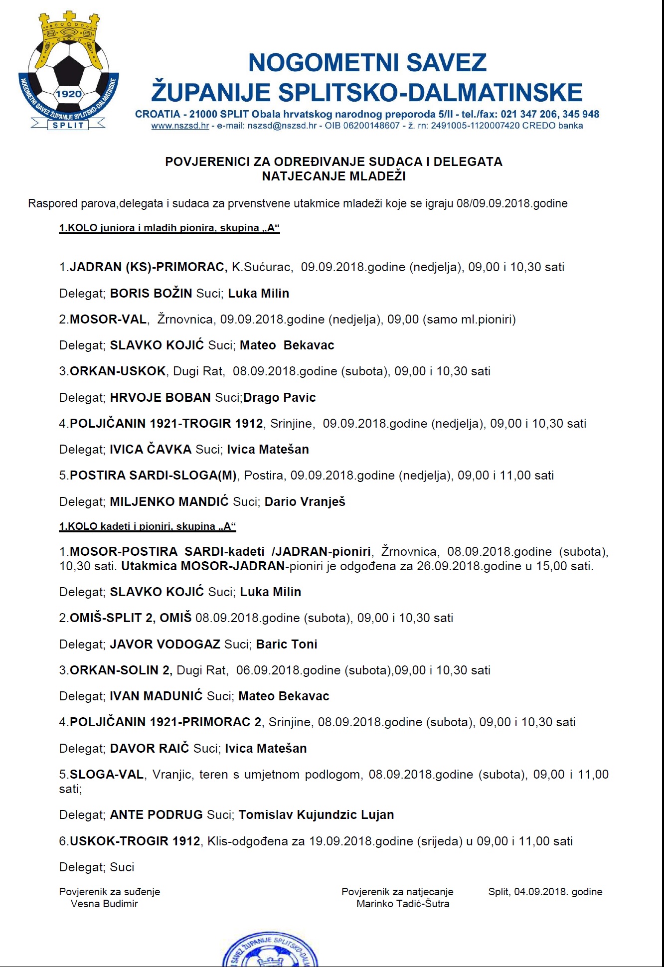 Raspored parova, delegata i sudaca za prvenstvene utakmice liga mlađih kategorija