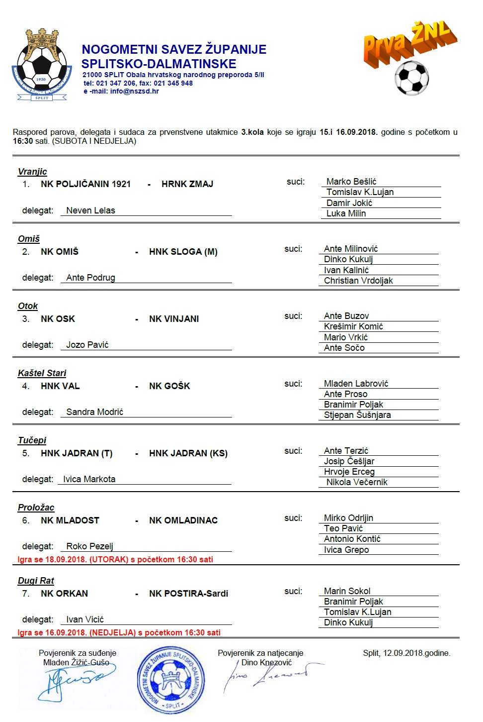 Raspored parova, delegata i sudaca za 3. kolo 1. ŽNL