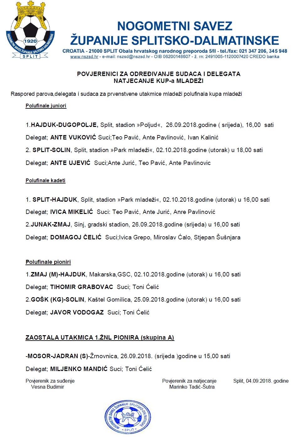 Raspored parova, delegata i sudaca za polufinale kupa mladeži