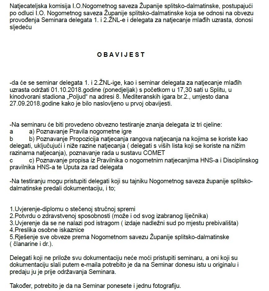 SEMINAR DELEGATA – OBAVIJEST
