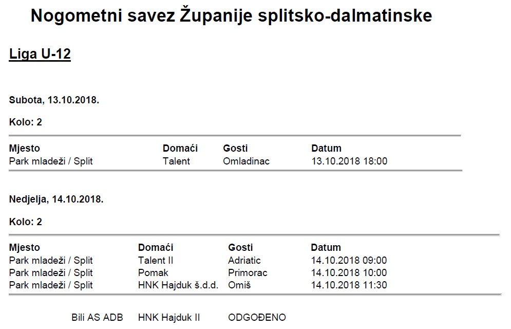 Raspored odigravanja utakmica 2. kola Lige U-12