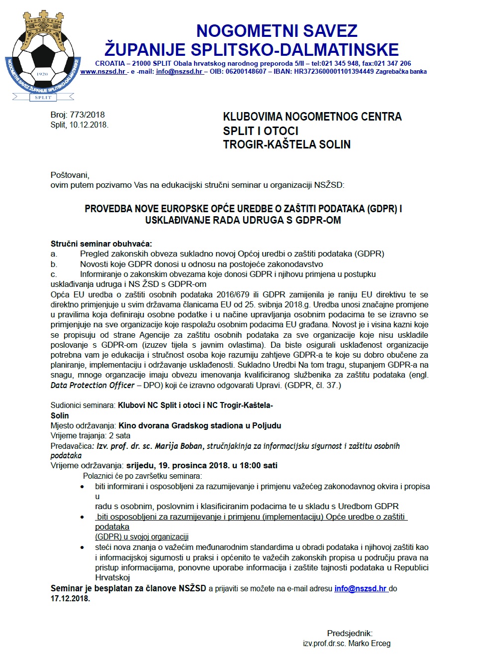 Stručni edukacijski seminar vezano za provedbu Opće uredbe o zaštiti podataka (GDPR)