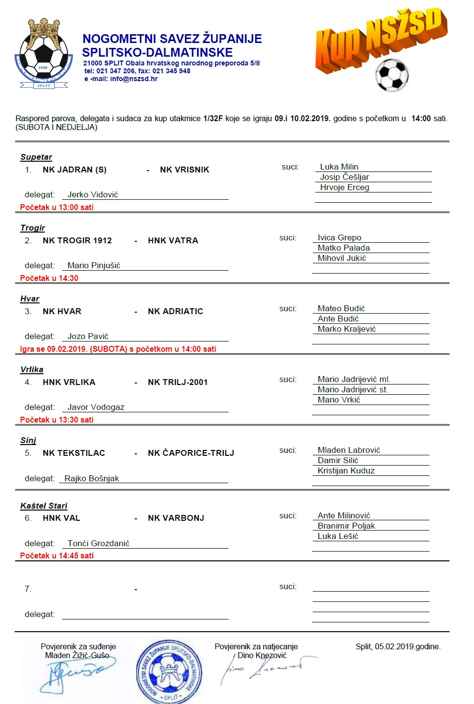 Raspored parova, delegata i sudaca za utakmice pretkola kupa