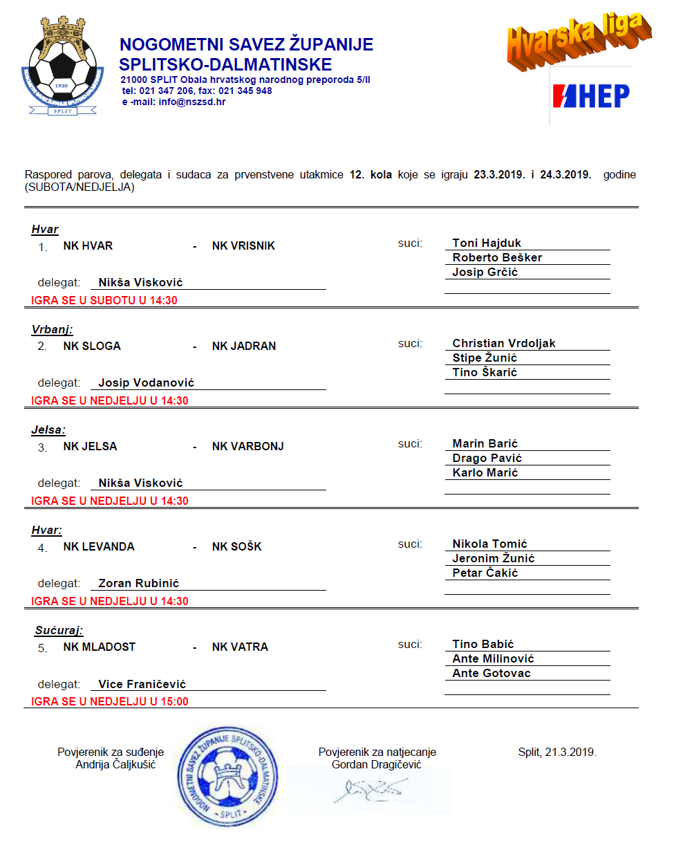 Raspored parova, delegata i sudaca za prvenstvene utakmice 12. kola Hvarske lige – HEP koje se igraju 23. i 24.03.2019. godine