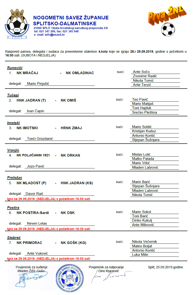 Raspored parova, delegata i sudaca za 4. kolo 1. ŽNL