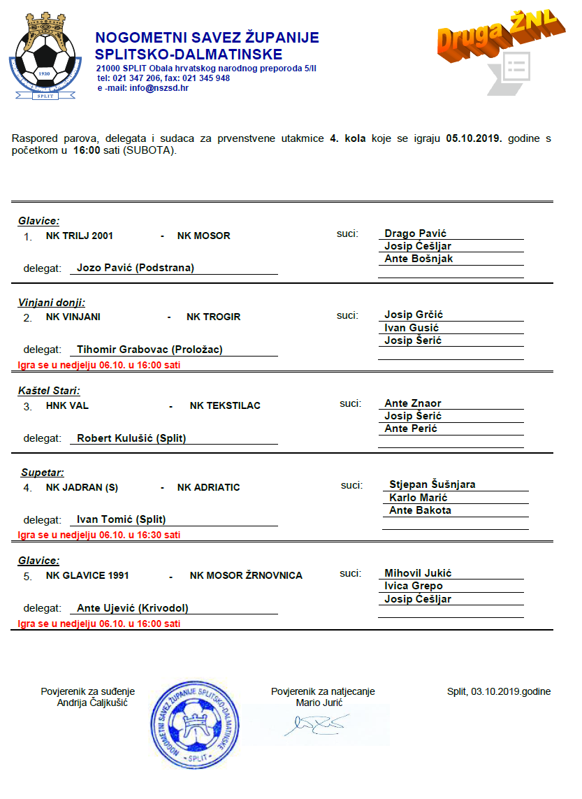 Raspored parova, delegata i sudaca za prvenstvene utakmice 4. kola