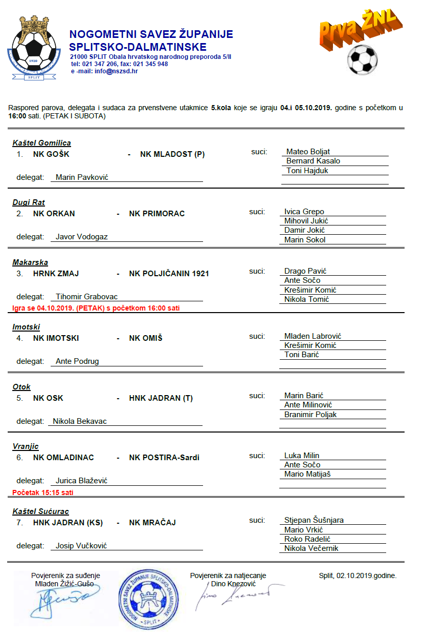 Raspored parova, delegata i sudaca za 5. kolo 1. ŽNL