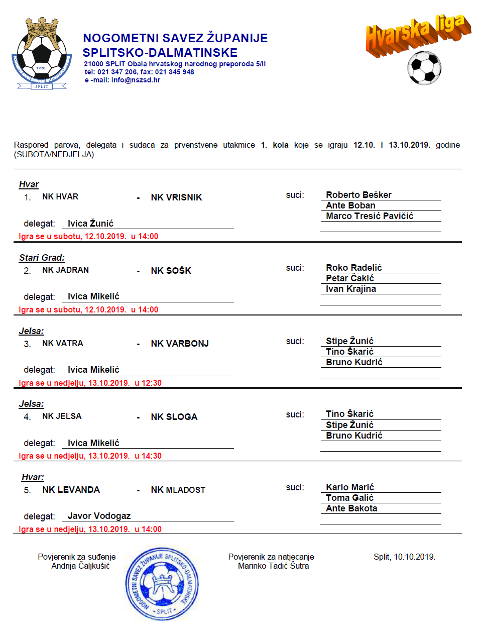 Raspored parova, delegata i sudaca za 1. kolo Hvarske lige