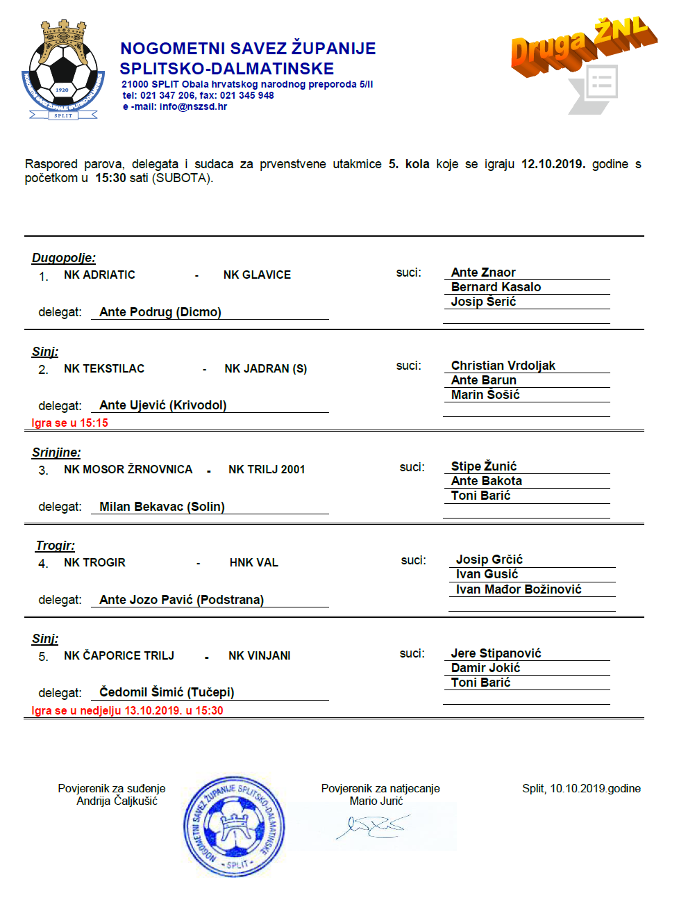 Raspored parova, delegata i sudaca za 5. kolo 2. ŽNL