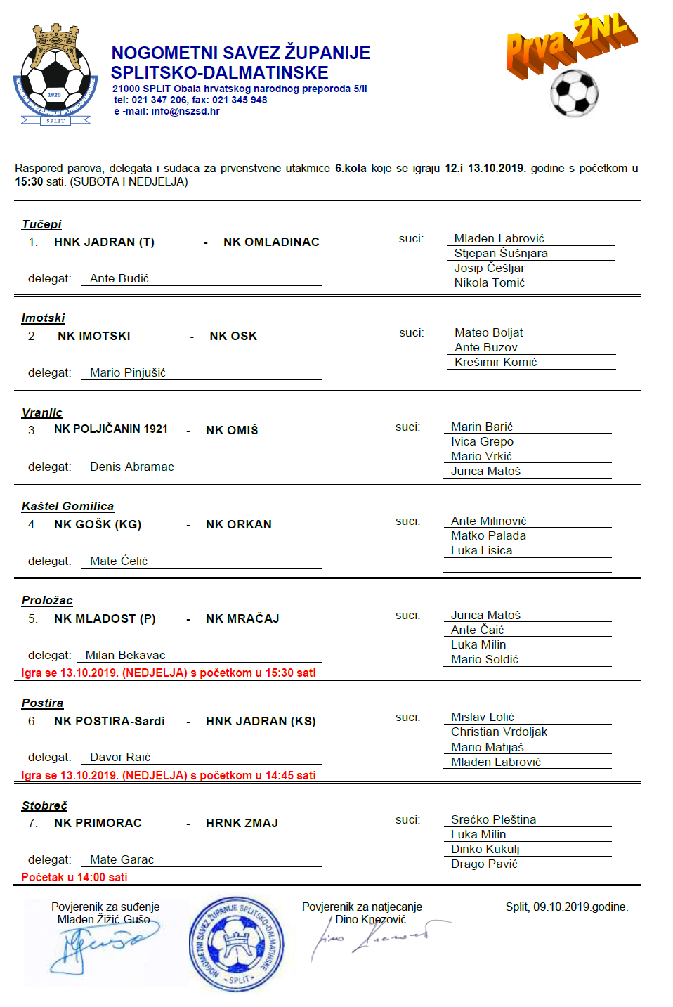 Raspored parova, delegata i sudaca za 6. kolo 1. ŽNL