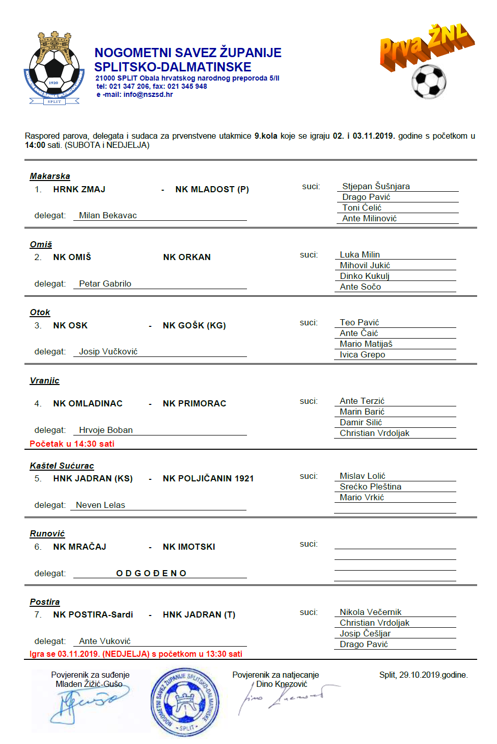 Raspored parova, delegata i sudaca za 9. kolo 1. ŽNL