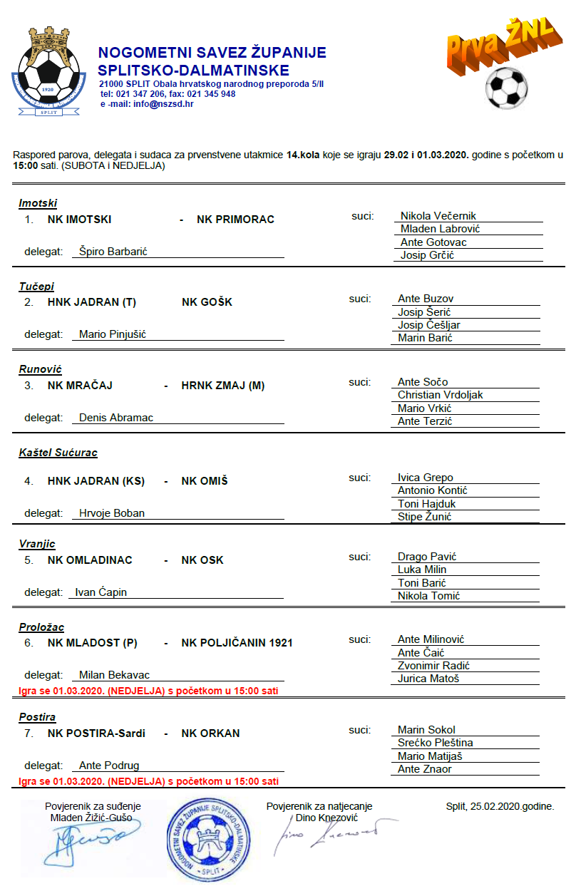 Raspored parova, delegata i sudaca za 14. kolo 1. ŽNL
