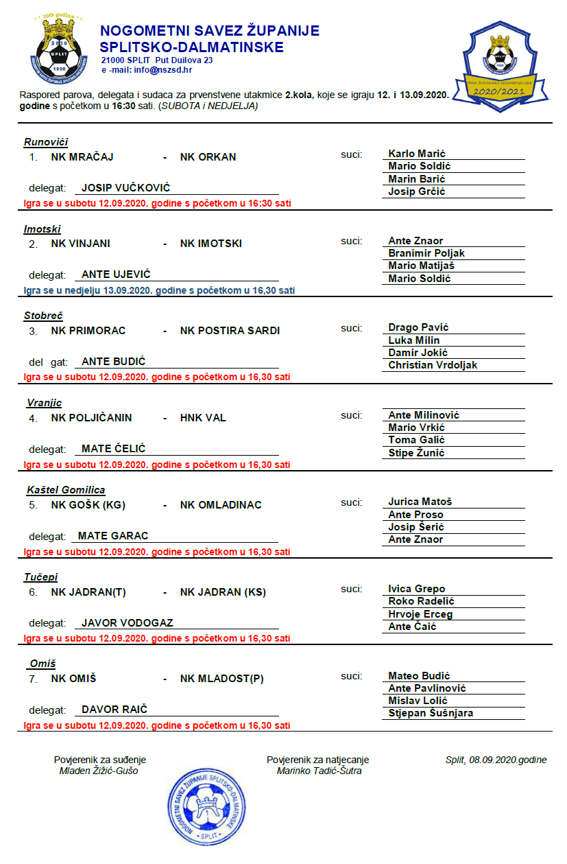 Raspored parova, delegata i sudaca za prvenstvene utakmice 2. kola